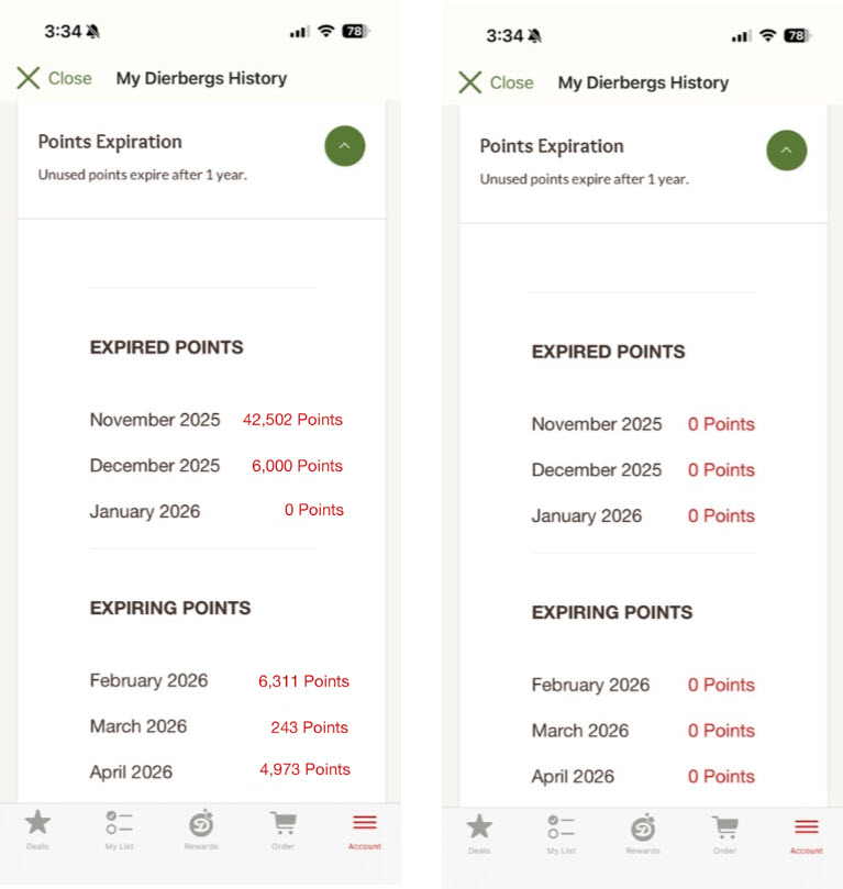 In the Dierbergs App, tap “Account” in the bottom menu bar -> then tap “My Dierbergs History” -> then click the green drop-down arrow next to “Points Expiration” to see if you have points expiring soon. We have included screenshots below as examples of upcoming expiring points vs. no points set to expire soon.